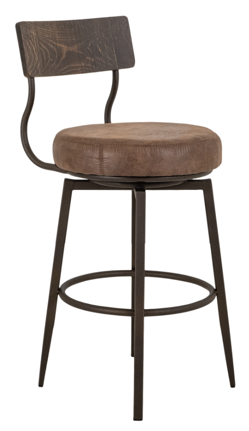 The backrest features a wooden panel, adding a warm, natural element to the stool's design