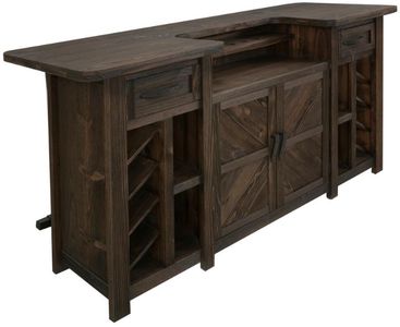 The Dutton Bar blends charm with practical storage. Crafted from lightly distressed wood in a rich brown multi-step lacquer finish, it features two doors and two drawers, offering ample space to keep your bar at home organized and stylish.Read More