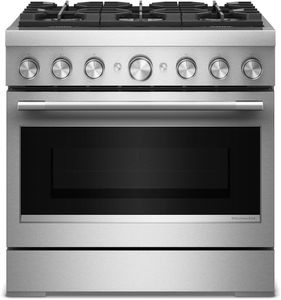 Expand your skills with a 36-inch KitchenAid® Commercial Style Range with 6 burners. This dual fuel range combines a gas cooktop with the even baking of an electric oven. Two 20,000 BTU Ultra Power™ Dual-Flame Burners offer the power and precision to successfully sear, simmer, stir-fry and sauté. Even-Heat™ True Convection gives consistent baking and roasting, plus air fry mode that yields crispy, golden results.Read More