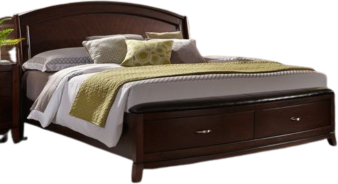Crafted with poplar and pine solids with cherry veneers, this piece features bead molding bow front drawers, and the step top on the footboard add an edgy look. Store clothing or blankets in the full extension drawers located in the footboard equipped with dust proofing to protect your belongings and antique pewter hardware to make for easy opening.