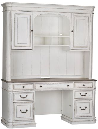 Blend European influences to create the Magnolia Manor credenza and hutch. Crafted with poplar and rubberwood solids with white oak and birch veneers, this piece features framed drawer fronts accented by antique pewter hardware, two large file drawers that can be locked, an open display for storage illuminated by touch lighting, and a flip-down keyboard tray. With today's modern technology in mind, users can enjoy the convenience of the built-in wire management provisions, two outlet ports, and two USB ports. The planked back panel flows throughout the hutch, even behind the two doors where adjustable shelving is located. Warm antique finishes and artistic distressing along with grand scale a group to be passed to generations.Read More