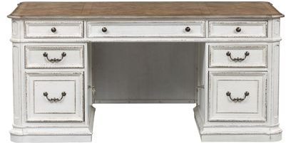 Indulge in the perfect blend of European design with the Magnolia Manor desk. Crafted of poplar solids with white oak and birch veneers, this set features seven fully stained full extension drawers, including two locking file drawers, a flip down keyboard tray that enhances user convenience, 2 hidden doors, wood framed drawer fronts, and canted corners. The top is finished in a weathered brown with whitewash in a fancy face veneer grain direction, bail pull and knob hardware in an antique pewter, features rounded pilasters. Warm antique finishes and artistic distressing along with grand scale create a piece to be passed to generations. With today's modern technology in mind, users can enjoy the added convenience of the built-in wire management provisions, making working from home a breeze.Read More