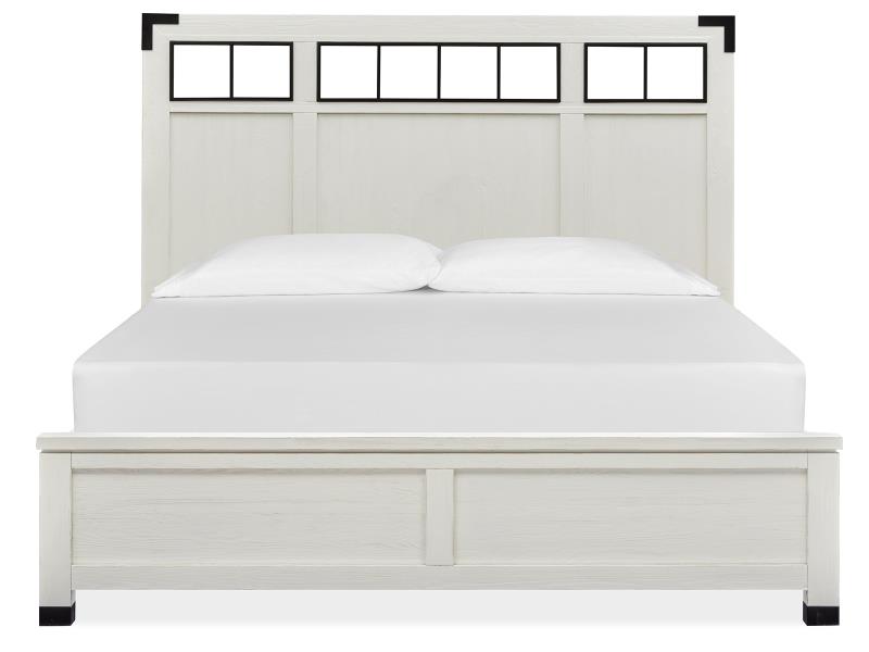 Farmhouse fresh meets industrial chic in the Harper Springs Collection. The board-and-batten construction of the signature panel bed evokes architectural details from 19th and 20th Century farmhouses, and window-pane motifs in textured glass on key pieces are inspired by the black metal windows of classic farmhouses and reclaimed factories. Black metal ferrules, corner brackets and forged iron hardware bring an industrial modern vibe to the craftsmen-like silhouettes. A black metal bed and a black mirror with window-pane border provide a dramatic contrast to the soft Silo White finish with rub-through and distressing. Harper Springs is crafted of random-width solid Pine for an authentic and casual feel. Whether you aspire to loft living or country living, the Harper Springs Collection will bring your dream home to life.