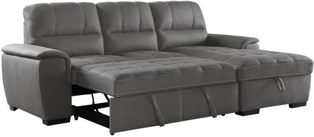 Conveniently stored beneath the sofa is a pull out trundle that rises to create a bed while the top of the attached chaise opens to reveal ample storage space. The sofa is offered in gray textured plush microfiber with contrast stitching.Read More