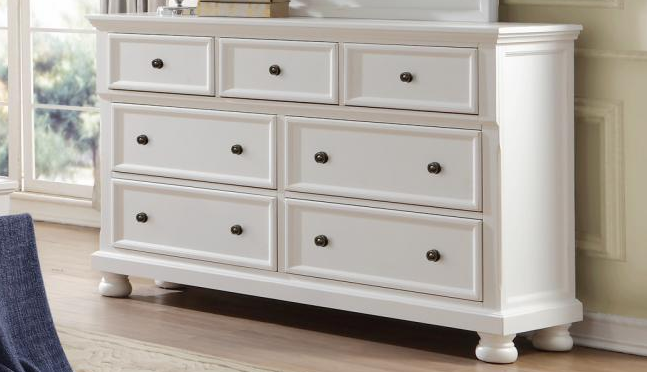 Black and White sand-through finishes are available creating distinctly different looks from traditional to country casual, with antiqued bronze knob hardware punctuating the look of each framed drawer front. Hidden drawers in the nightstand and dresser provide discrete storage for your valuables, while the storage drawers of the footboard provide a more visible means of additional storage capability. Bun feet support the case goods and a sleigh headboard finish off the transitional design of the collection.