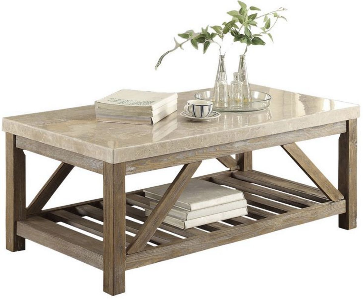 Industrial styling is softened by the blending of natural elements to create a stylish look in the Ridley Collection. A creamy white stone marble top is supported by the weathered wood finished base of each table – comprised of wood framing that includes display shelving with slat construction and angled supports.Read More
