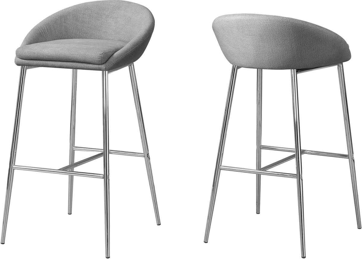 With simple lines and contemporary styling, this set of 2 bar height bar stools will transform your entertainment area. The soft and smooth cushioned grey fabric seat with a low profile curved back gives a sleek modern look to a room. The sturdy chrome metal base with a convenient foot rest makes it easy and comfortable for friends and family to hang around when entertaining. This is the perfect seating for an open loft, condo, or small spaces.