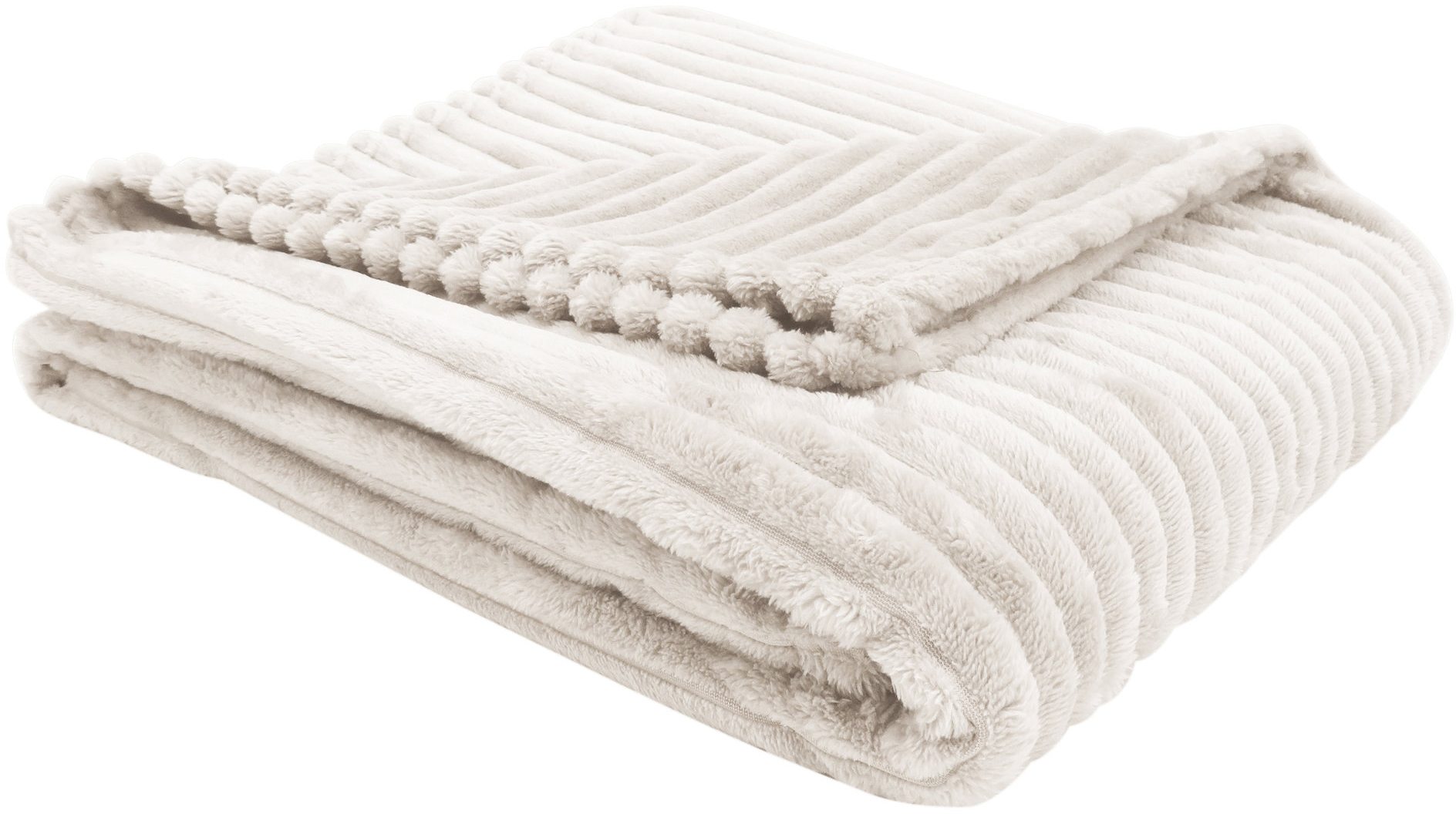 Get cozy with this ultra soft faux fur throw designed in a classic ribbed style on both sides. The warm ivory colour gives a casual luxurious touch to your decor whether you throw it over your bed ready to grab for an afternoon nap or curled up on the couch with a good book or movie night. Made from an easy care polyester material that is machine washable, making it perfect as a light layer of warmth and fashionable decorative accent throw for any room in your home.