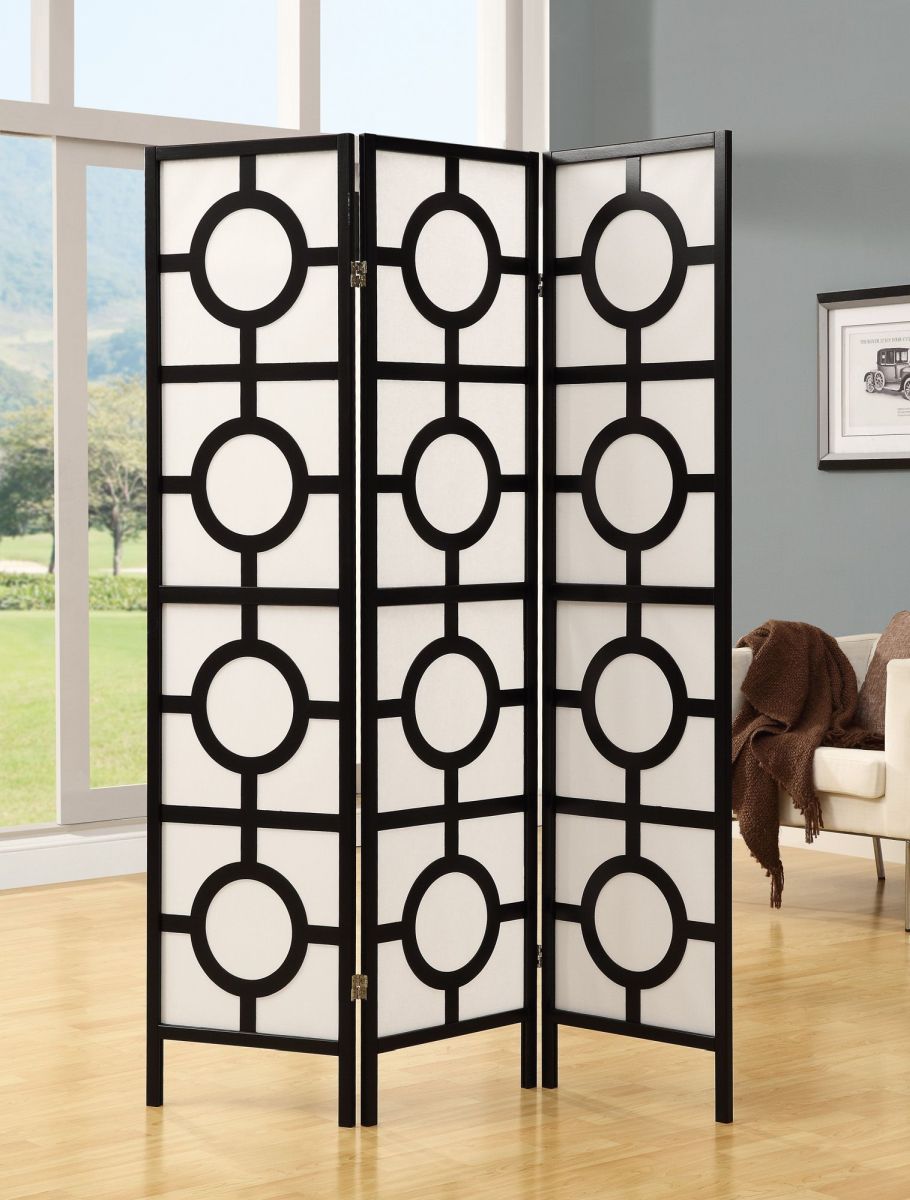 Add a beautiful touch to your living space with this 3-panel wooden folding screen. The elegant black frame accentuates the geometrical circle design, overlaid in thick rice paper to gently filter in the light. Use this folding screen as an accent piece or room divider in your living room, bedroom, or guest room for a simple chic look.Read More