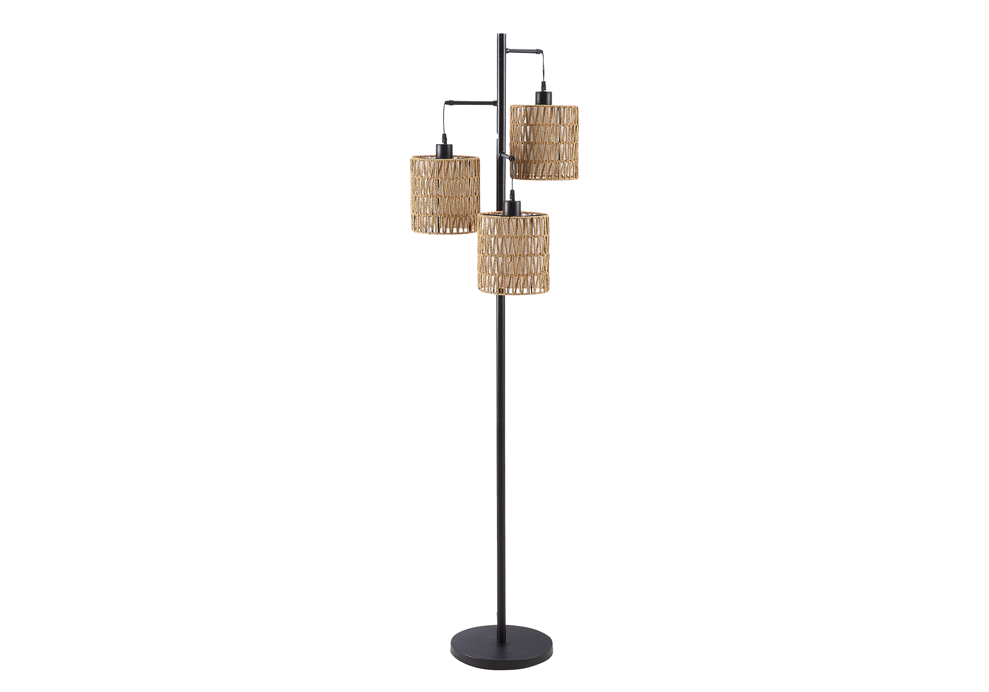 This 73" high floor lamp features a chic black metal frame paired with 3 natural rope shades, creating a stylish accent piece that effortlessly brightens your living room, bedroom, or office space