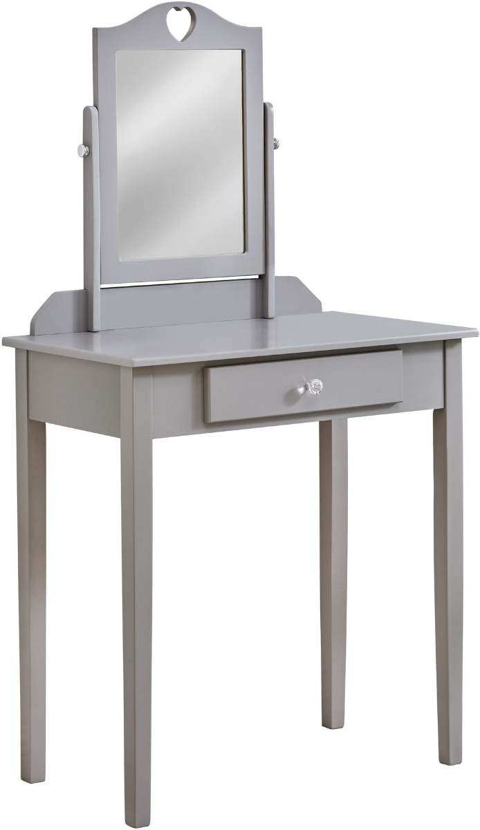 Every girl wants her own special spot to practice her beauty regime, and this contemporary style vanity table with mirror will be a stand-out in her bedroom. The smooth grey satiny finish gives a warm feel to a room, with a spacious tabletop to place a hairbrush, makeup, or special perfume. The closed storage drawer, accented with a crystal look knob for a touch of glam, is handy to store other small makeup or hair supplies. The mirror with the cute heart cut-out on top, tilts so she can get a good view at any angle. This dresser table on solid wood legs will keep everything organized in one place whether she is trying out new hairstyles, getting ready for school, or a fun day out with friends! Assembly is required.