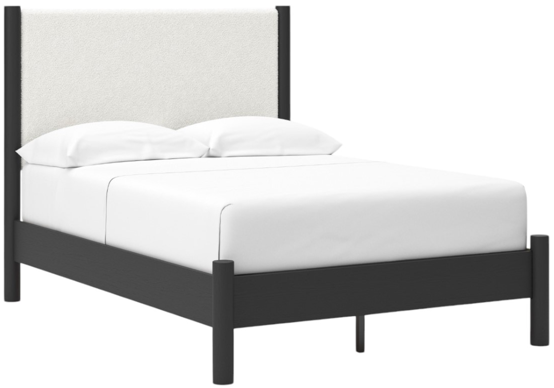 Includes upholstered panel headboard, panel footboard, rails and roll slats