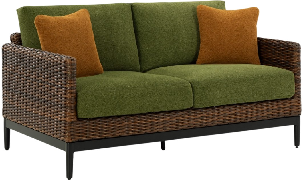 This outdoor loveseat recalls the aesthetics of nature to bring an inviting, high-style feel to your patio or lanai. Its Nuvella+™ performance fabric is made with enhanced UV resistance, so the chic green hue stays brighter for longer. Worried about the weather? Don't sweat it—the durable resin wicker withstands the elements from season to season.Read More