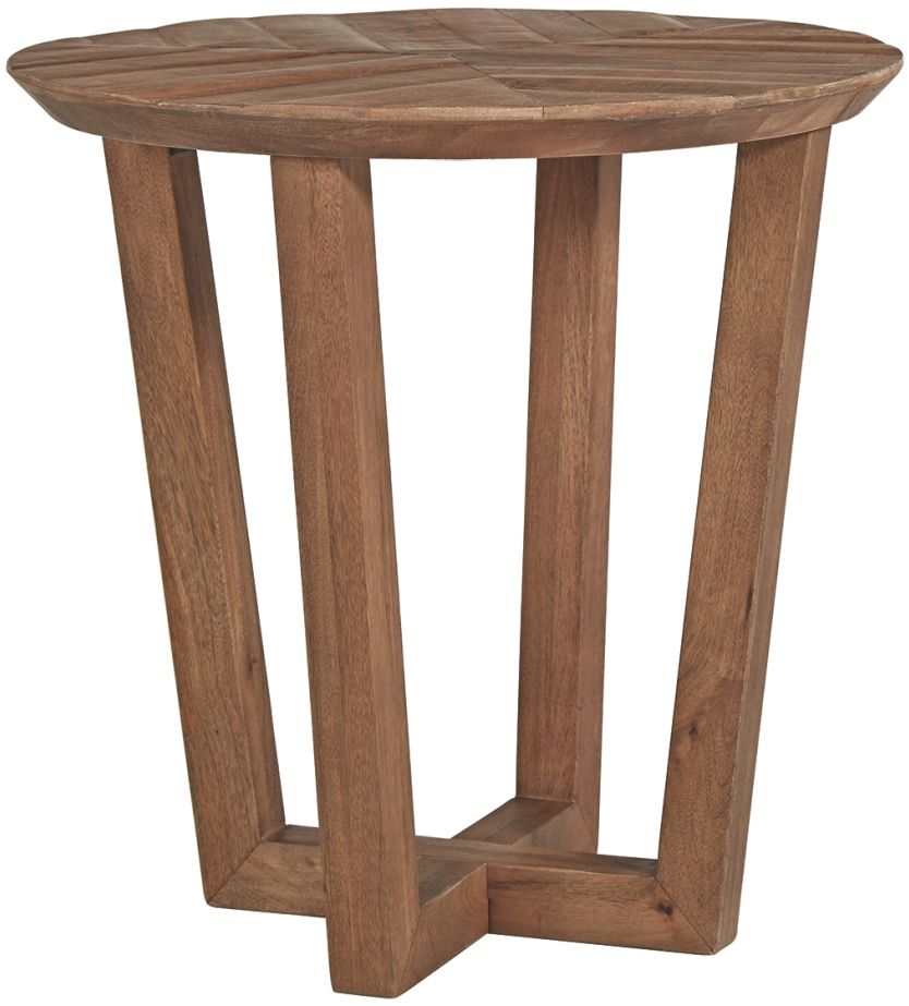 Round out your seating area with this end table in a contemporary round design. Angled legs are simple, yet striking—while its planked mango wood top is anything but ordinary. A rich, waxy finish enhances the wood's tonal variation for a look sure to entice.