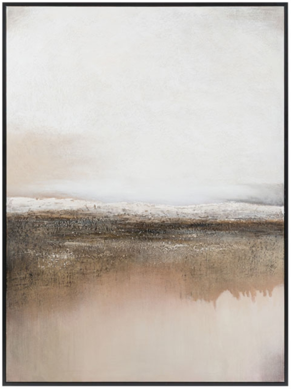 This wall art brings an abstract, tranquil vibe with layered shades of brown, gray, and white. The gallery-wrapped canvas set in a sleek black frame draws the eye while remaining subtle. Its hand-painted finish and vertical orientation make it a refined yet versatile accent for any wall.Read More