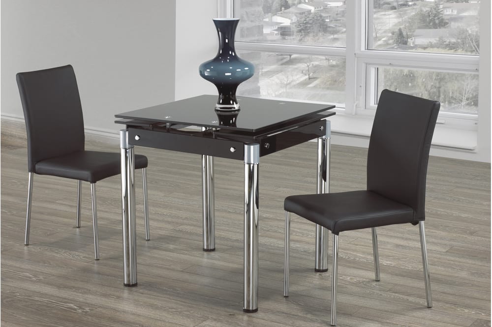 This Dinette set has a black glass top with chrome accented legs and extendable leafs on both sides, which make it accessible for any space.Read More