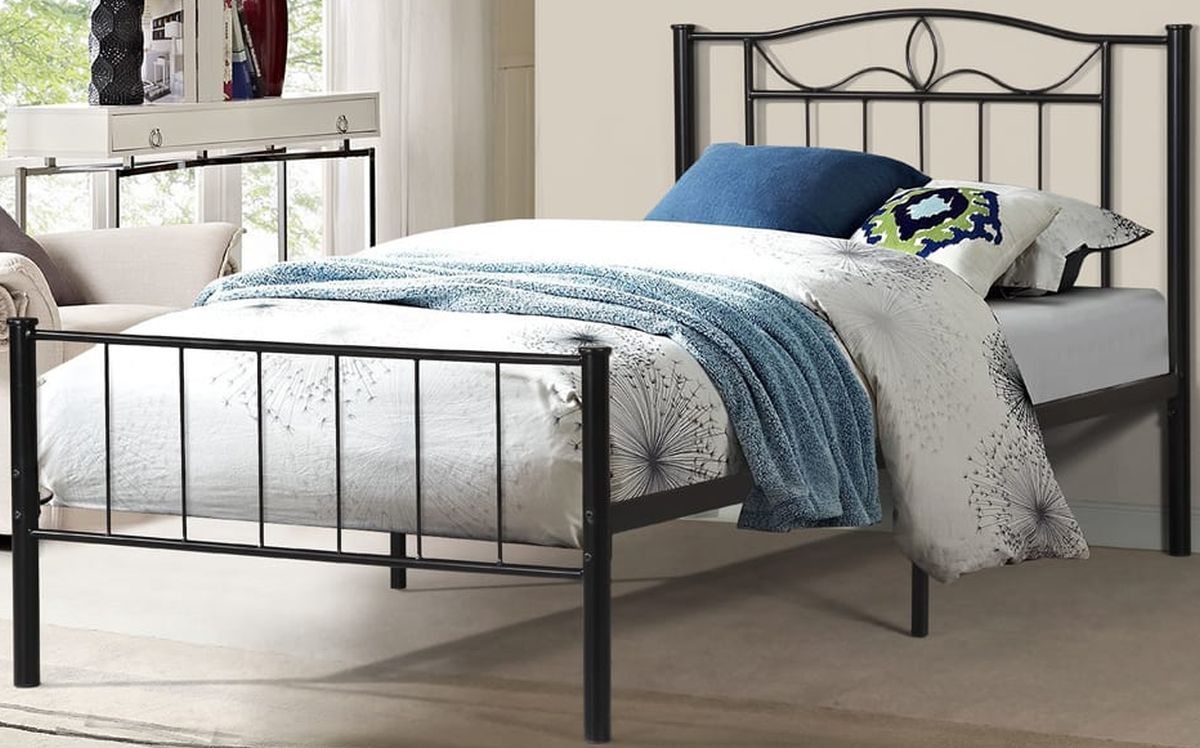 Crafted in sturdy metal, this platform bed adds a bit of style to its simple style with a curved footboard and headboard. Black powder coated finish.Read More