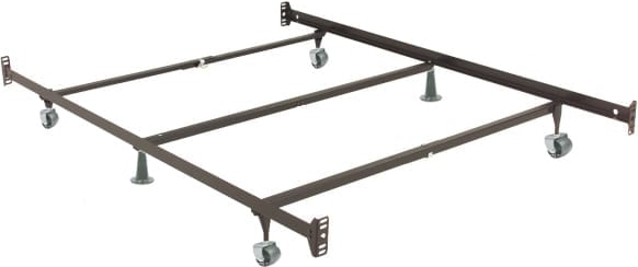 Heavy duty construction metal bed frame. Cross arms make for ease of assembly and locks securely in place. Easy to attach any Headboard with riveted headboard brackets. Locking legs create a triple-thick steel layer at the corners. Plastic glides provide maximum support and strength. Swivel rug roller wheels for ease of movement and mobility.Read More