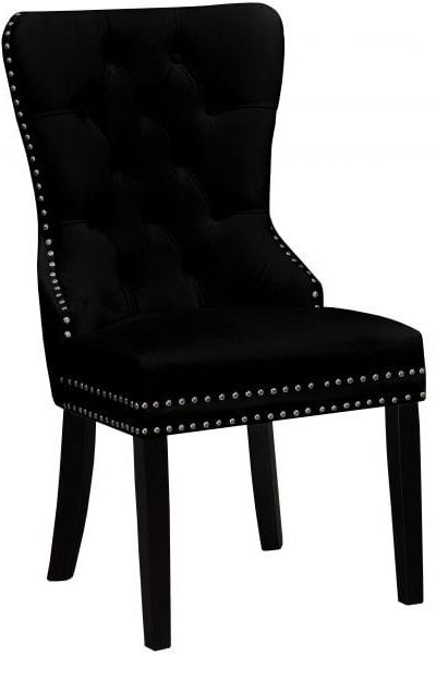 Overstuffed button tufting, bold nail head trim and a chrome finish knocker on the back of the chair for easy movement put these chairs into a class all their own. Available in your choice of black, cream or grey velvet fabric.