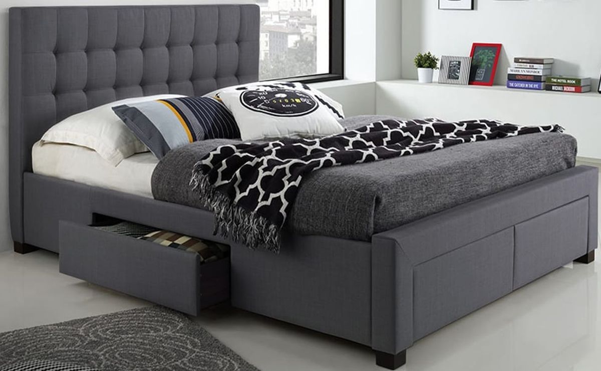 The prefect storage solution, this platform bed offers 2 footboard drawers, 2 side drawers, and is draped in beautiful charcoal grey, linen-style fabric. The contemporary design includes deep button tufting and clean lines. Drawers include full extension metal glides.Read More