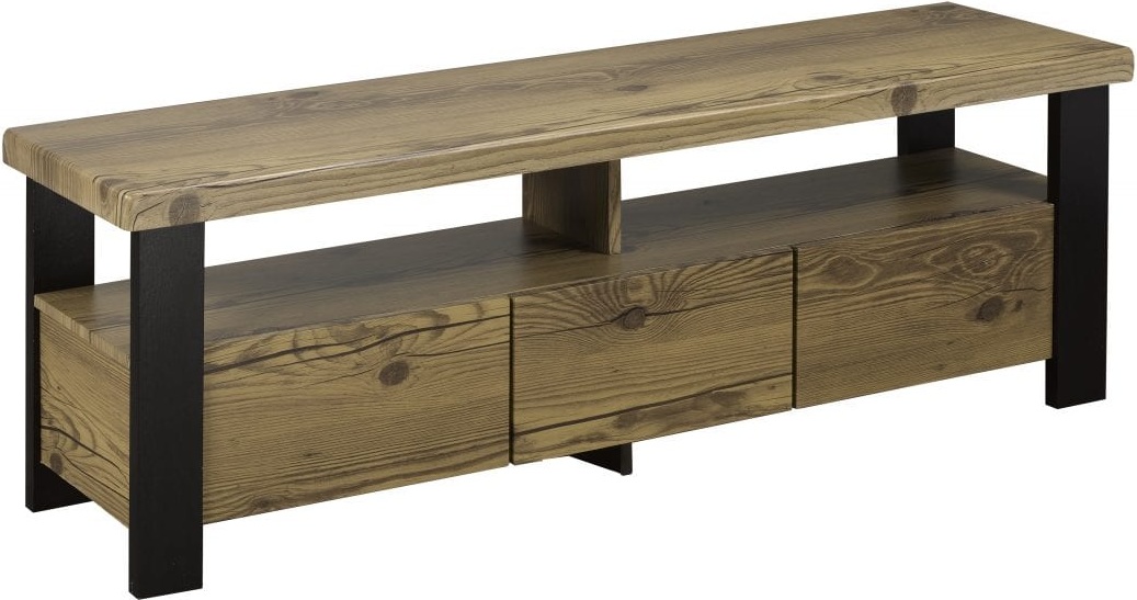 The two-tone contrast of this TV stand, with its distressed wood finish and the deep espresso legs, will add a dash of rich warmth to any living room. The open back shelf allows for easy wire management, while the three deep set drawers allow for great storage opportunities.Read More
