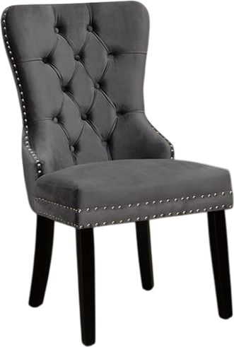 In your choice of black, cream or grey velvet-style fabric, chairs include nailhead trim, deep button tufting, and silver knocker on the back.Read More
