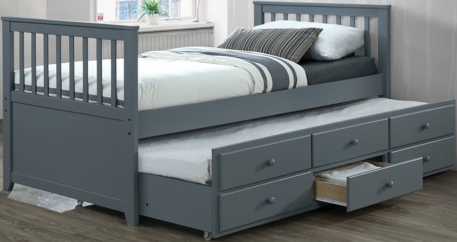 This multi-purpose 39" Twin Captains Bed is a great space saving solution with both storage and a trundle. The solid wood frame offers a sturdy sleeping space, while the side drawer pulls out to reveal both a trundle for an additional mattress (sold separately), and 3 deep drawers. Slats included, no box spring required.Read More