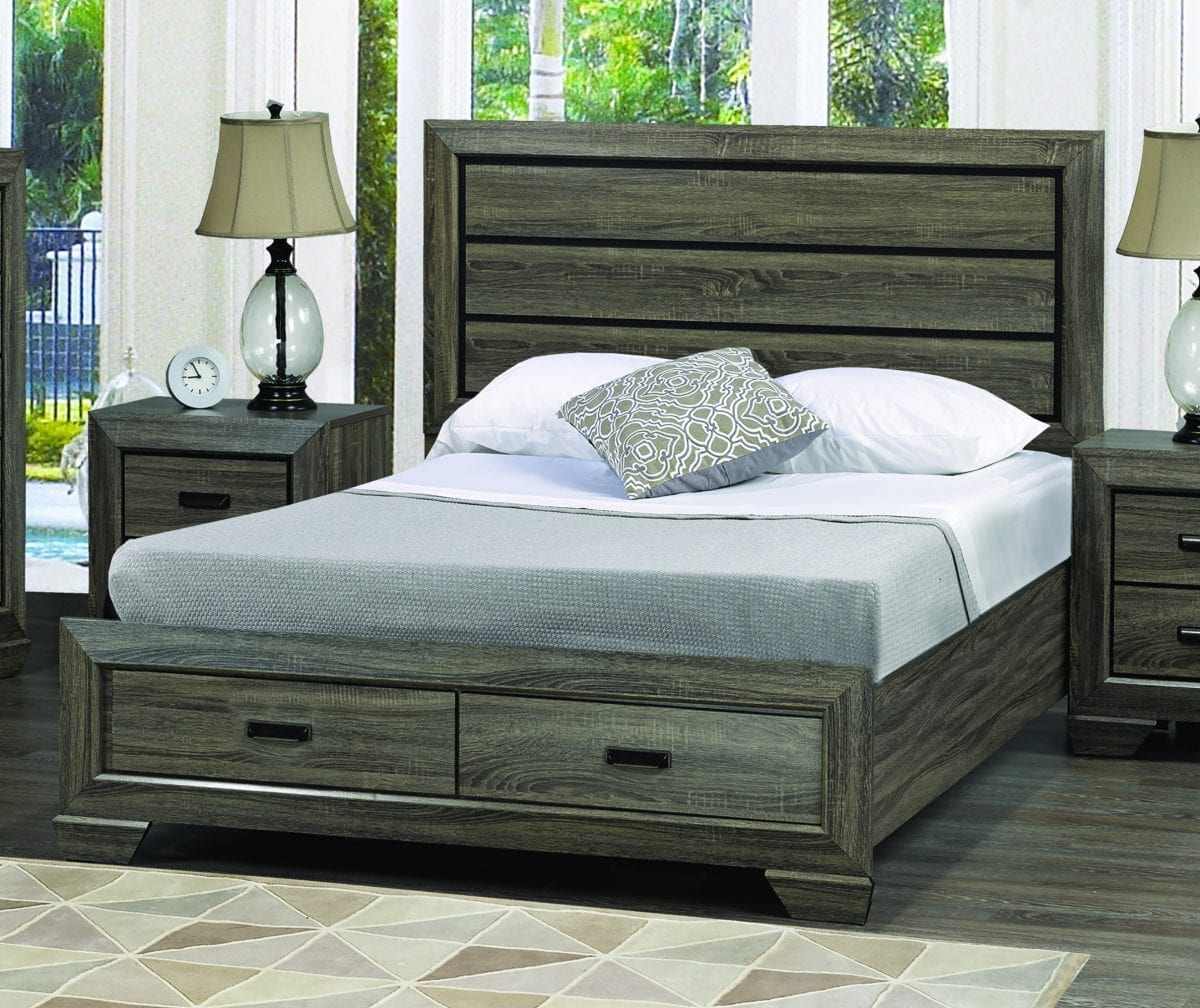 A true masterpiece of contemporary design, this storage bed offers inset paneling on the headboard, a grey grain finish, and includes two drawers in the footboard. Slats included, no box spring required.Read More