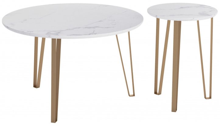 An elegant table set, the Caen fits any mid-century modern or glam setting, perfect for any space, dining, work, or open plan. The top is a durable medium density fiberboard laminate top with a marble print and steel legs powder coated in gold.Read More